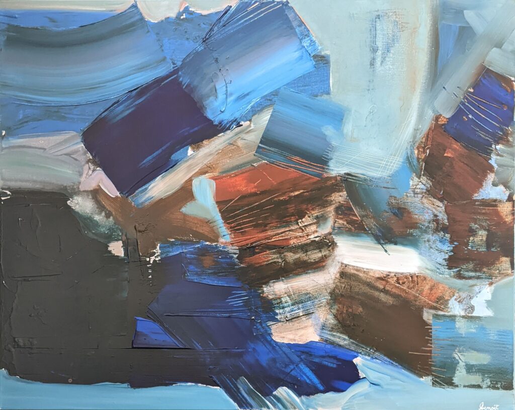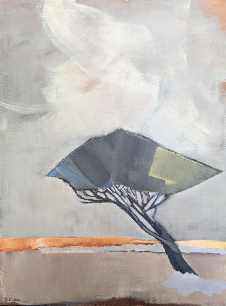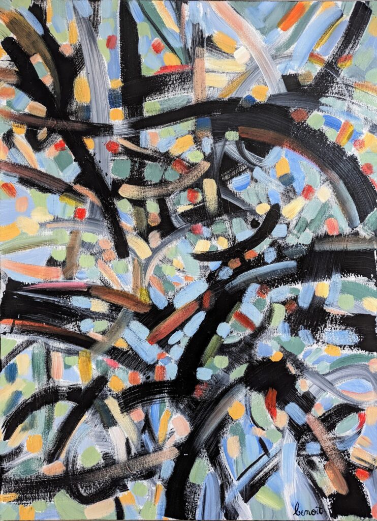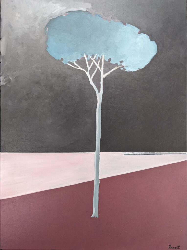 Même si mon domaine de prédilection reste mes compositions abstraites, j’ai toujours éprouvé le besoin d’avoir « mes » arbres à mes côtés. Dessinés, peints, imaginés…parfois à la limite de l’abstraction. Ils sont à mon image, bien enracinés et la tête dans les nuages. Quant à mes paysages, l’abstraction se fond souvent avec le figuratif. Pour certaines toiles, des évidences se dessinent. Pour d’autres, il faut un peu plus se projeter. Alors quelques indices laissent penser à un paysage, comme une couleur, une ligne, ou bien une trace.