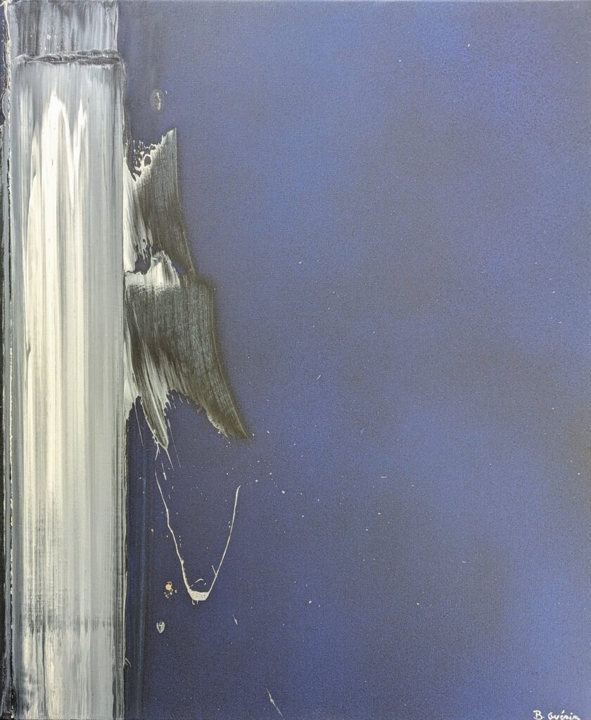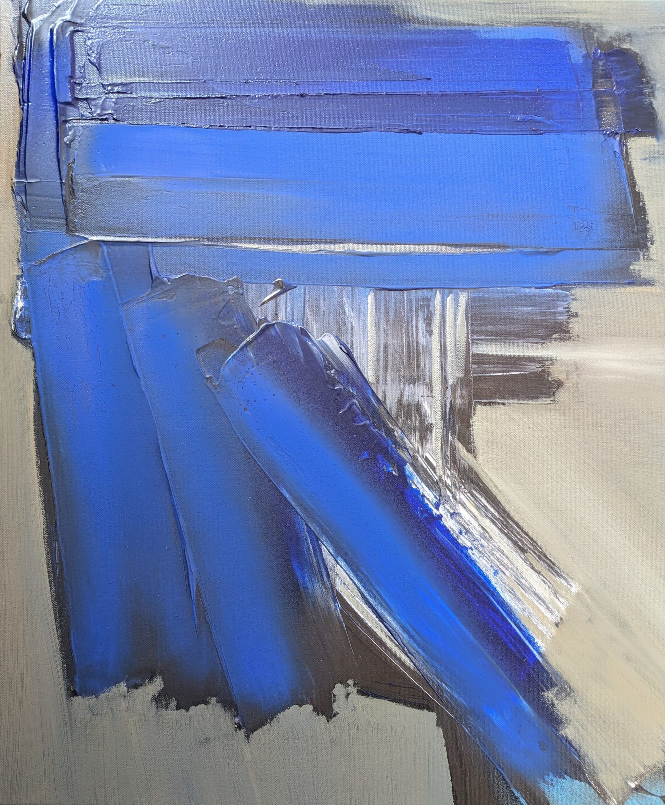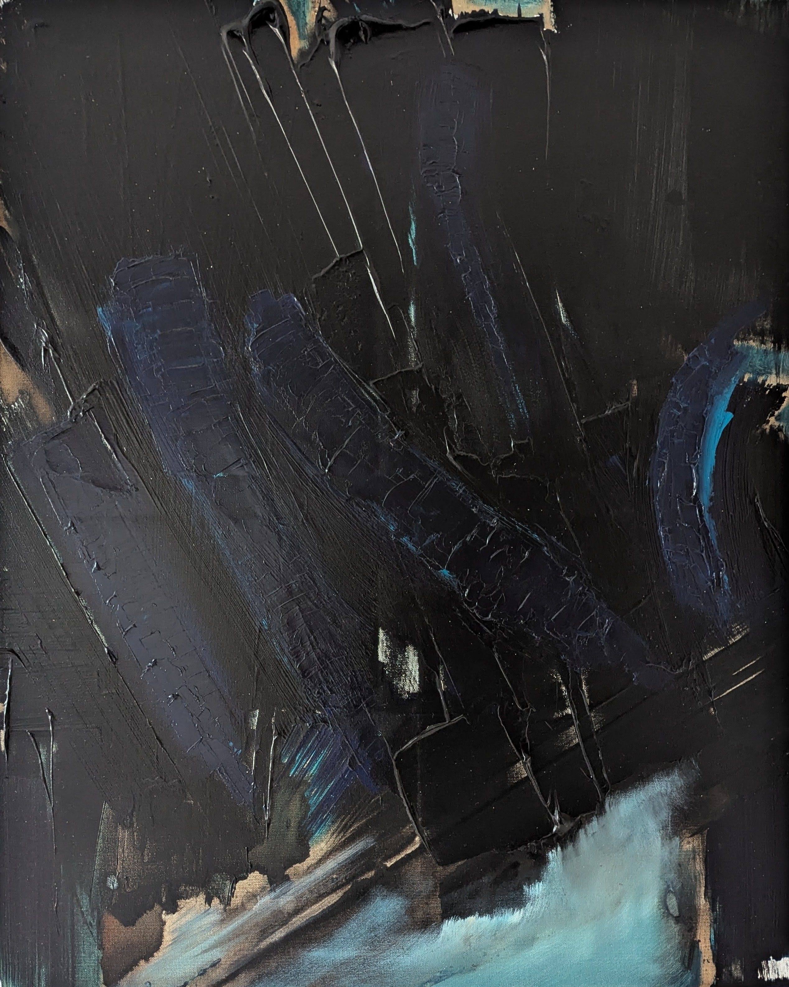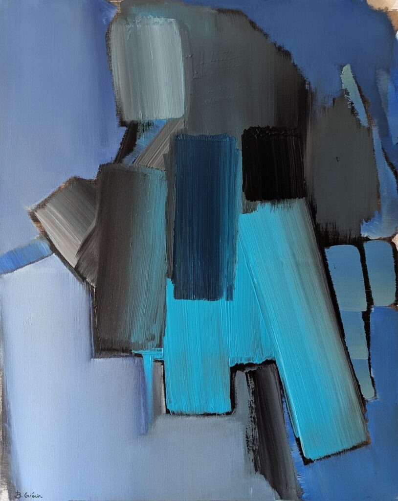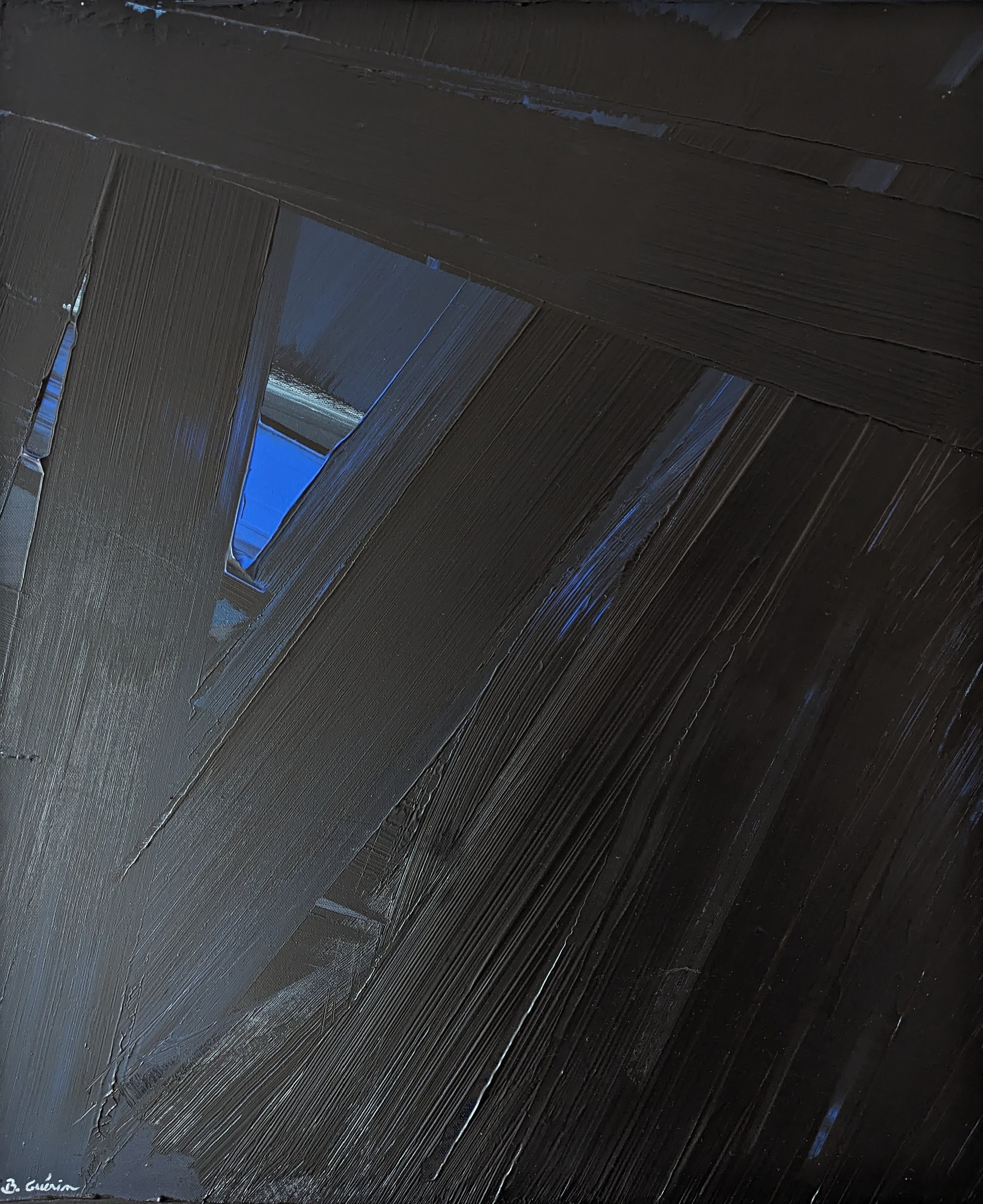 Quand j’ai commencé à peindre, j’ai vite été attiré par le travail de la matière. Les raclages, les écrasements, le jeu de la transparence et de l’opacité, la lumière, guident le geste et structurent mes compositions parfois colorées, souvent noires et bleues. Cette façon de peindre est ancrée au plus profond de moi. Les quelques souvenirs d’un père, artisan plâtrier à “l’ancienne”, ont certainement façonné mon goût pour ce travail de la matière. Blanche pour le père, et noire pour le fils. Comme deux extrêmes qui se rejoignent.