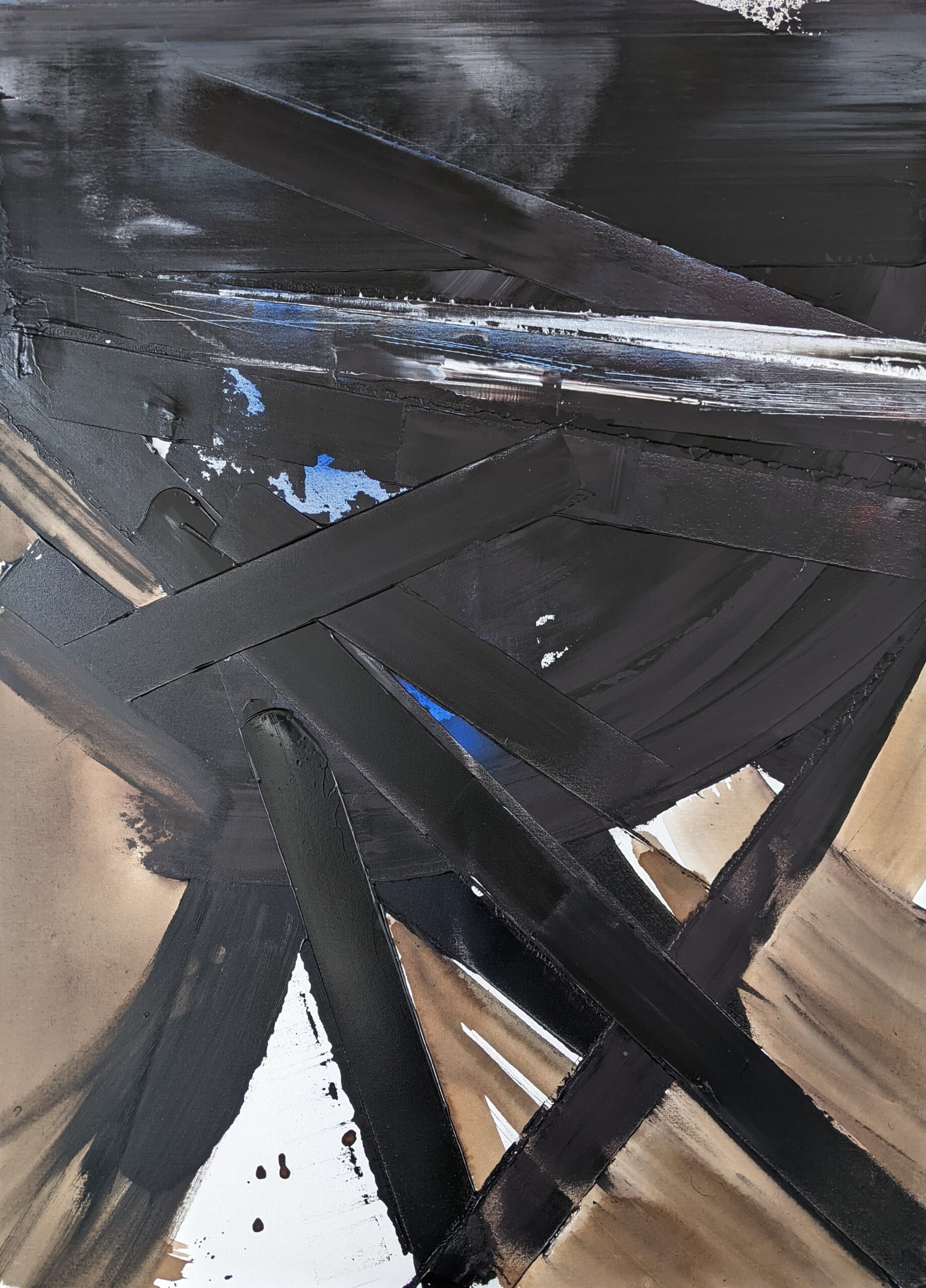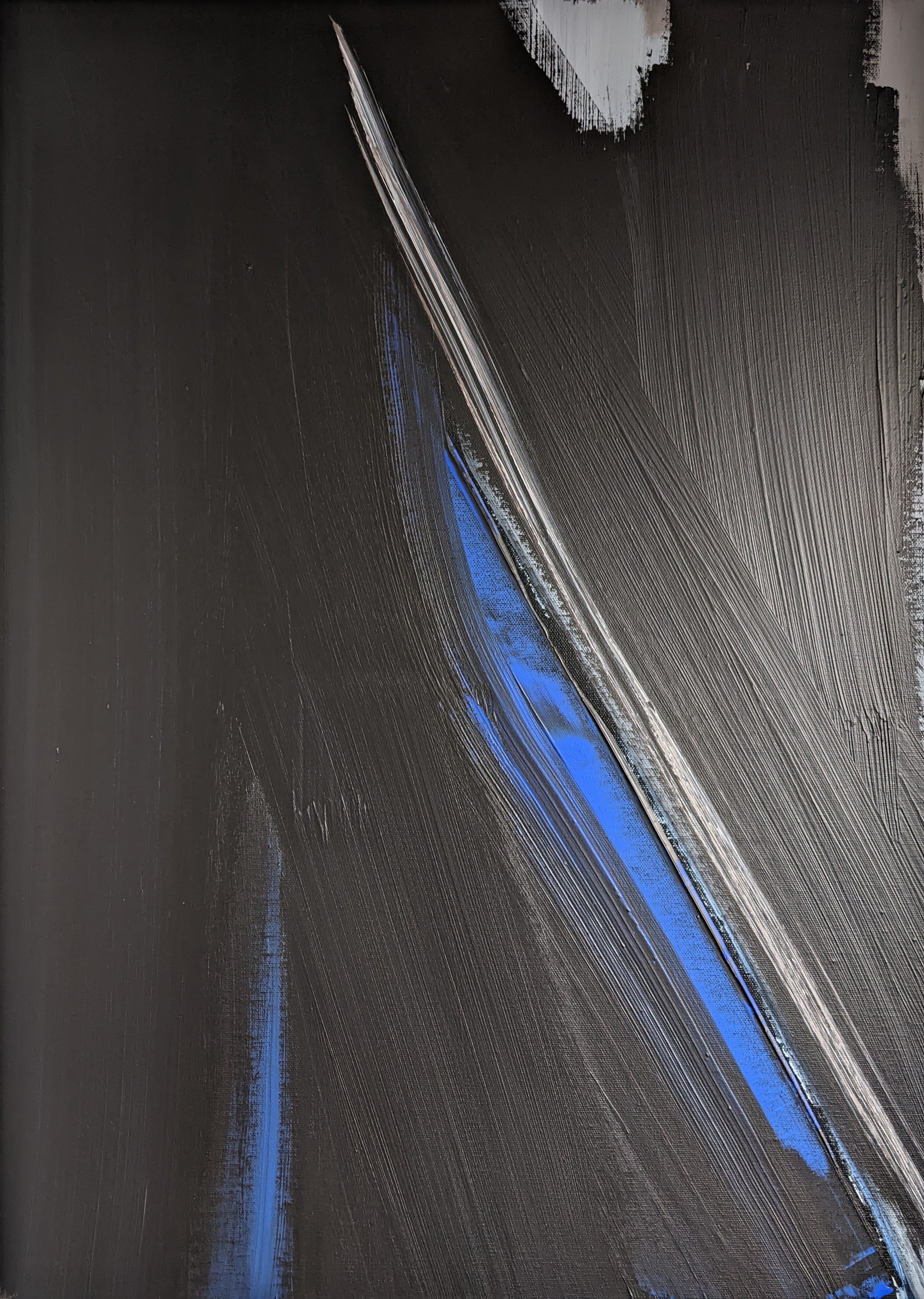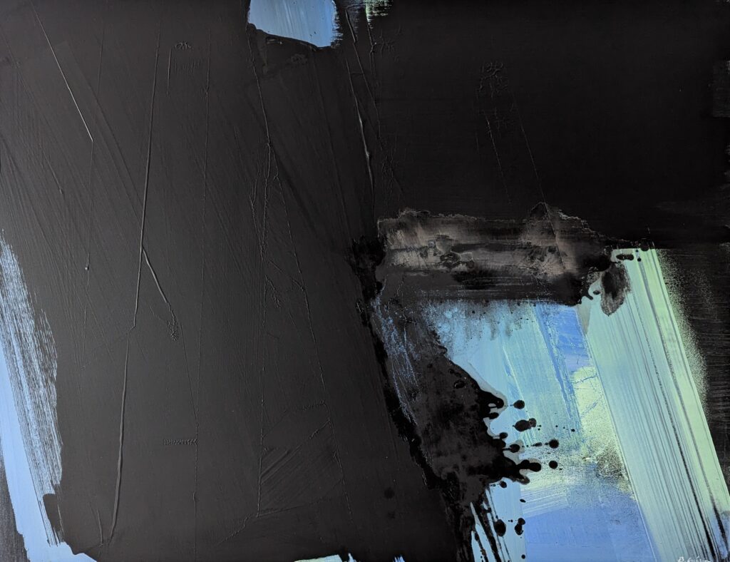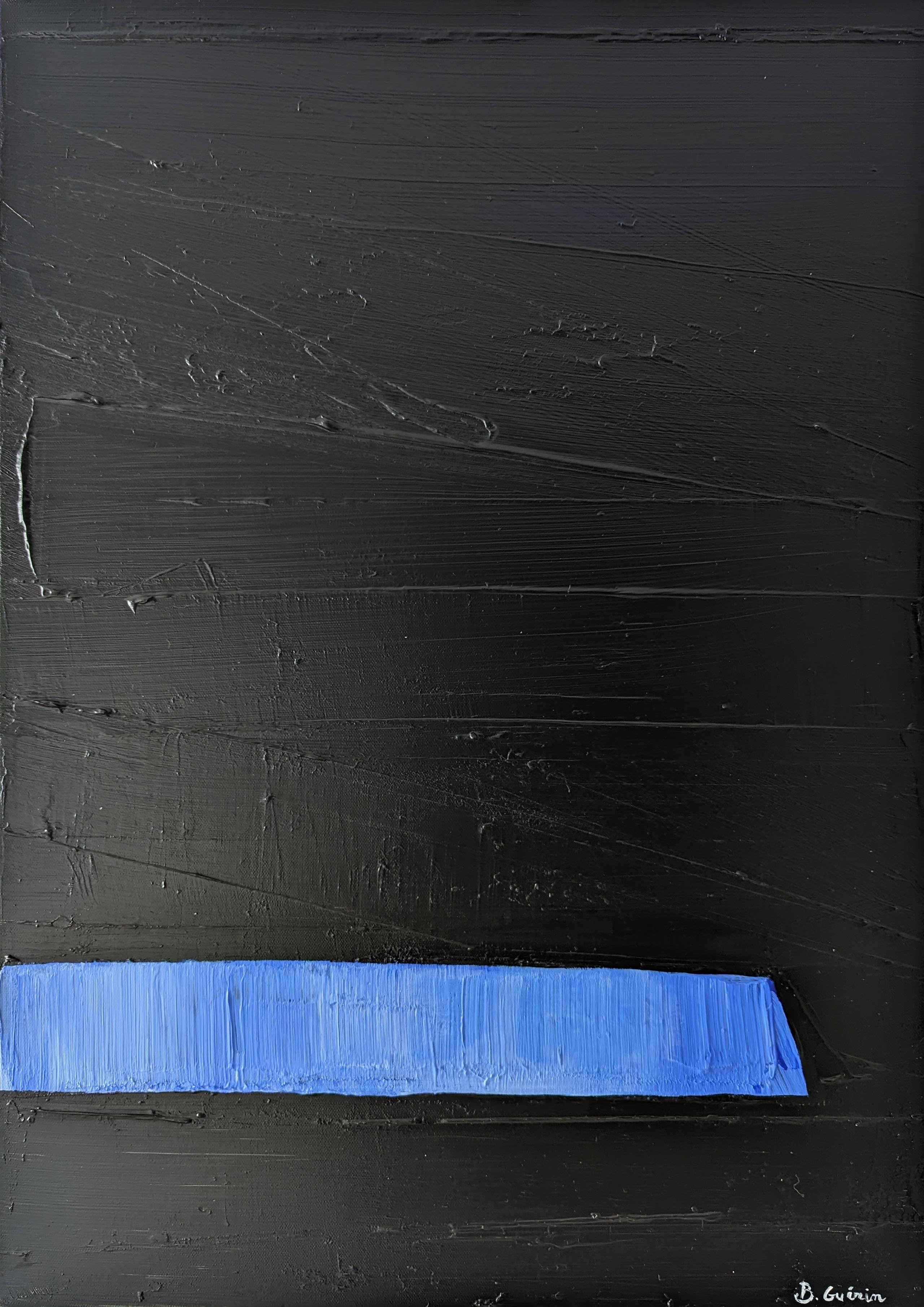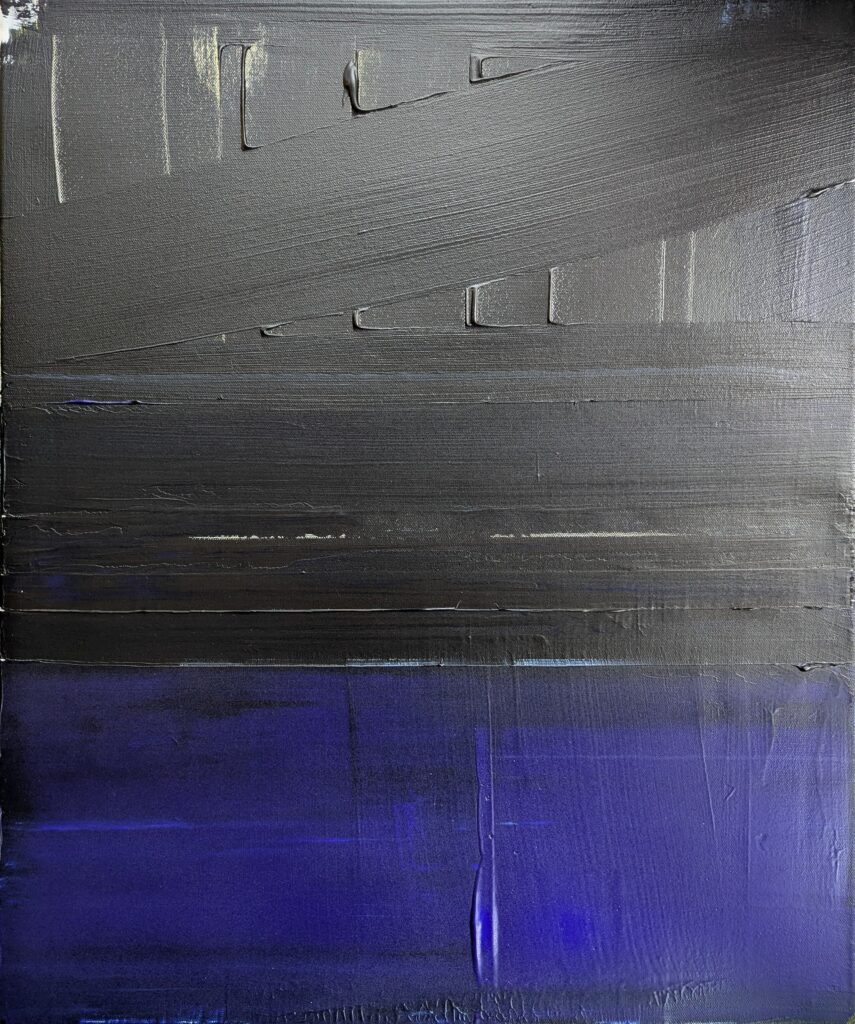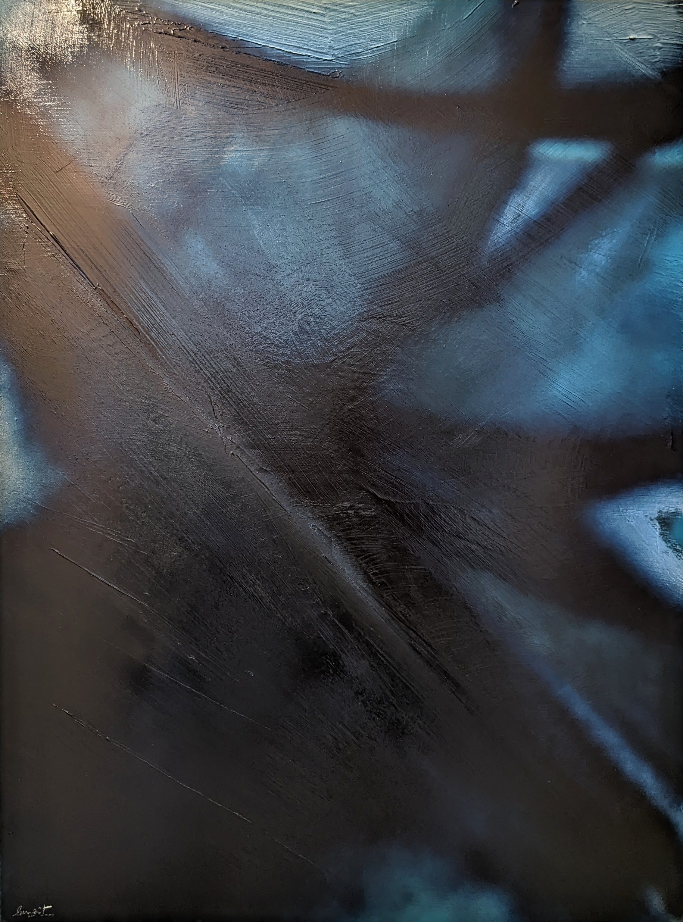 Quand j’ai commencé à peindre, j’ai vite été attiré par le travail de la matière. Les raclages, les écrasements, le jeu de la transparence et de l’opacité, la lumière, guident le geste et structurent mes compositions parfois colorées, souvent noires et bleues. Cette façon de peindre est ancrée au plus profond de moi. Les quelques souvenirs d’un père, artisan plâtrier à “l’ancienne”, ont certainement façonné mon goût pour ce travail de la matière. Blanche pour le père, et noire pour le fils. Comme deux extrêmes qui se rejoignent.